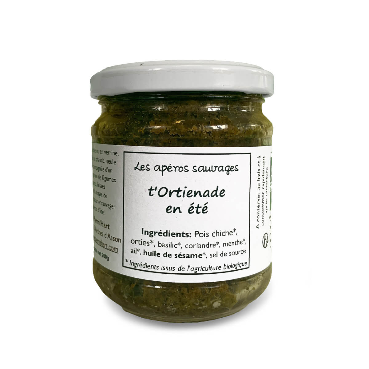 Ingrédients: Pois chiches*, orties*, basilic*, coriandre*, menthe*, huile de sésame**, huile d’olive*, sel de Salies de Béarn***